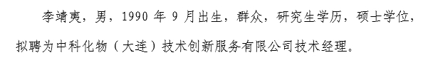 根据招聘评审结果,经研究,拟聘用李靖夷到中科化物(大连)技术创新服务有限公司技术经理岗位任职。